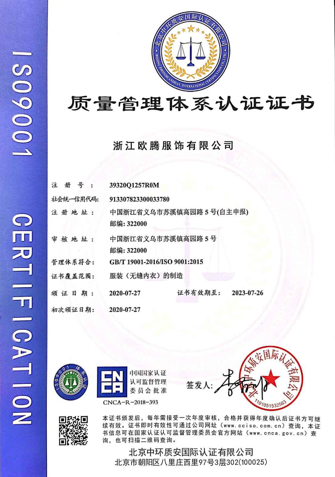 浙江歐騰服飾有限公司位于世界小商品之都-義烏。創立于2015年,是一家專業生產無縫針織運動服飾和內衣的工貿一體企業,擁有自主出口權。 工廠的占地面積約16000平方米 ,引進了大型圣東尼、高騰等多種先進的制衣設備300余臺。月產能可達90萬件。 歐騰服飾每年投入近百萬資金打樣開發新產品,有著一支高素質設計、技術員工隊伍。工廠先后通過了ISO 9001質量管理體系認證、BSCI認證、GRS認證、OEKO-TEX國際生態紡織品認證等多項專利檢測報告??商峁㎡EM&ODM服務。歐騰服飾以一套完整、科學的質量管理體系,生產的服裝從原材料紗線到成衣,質量完全能夠滿足國內、國際質量要求。獲得了客戶一致好評。工廠先后獲得省科技型企業、國家高新企業、義烏市誠信講信用單位、規上企業、信用AAA級等榮譽。